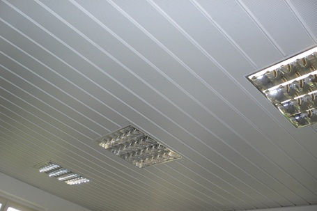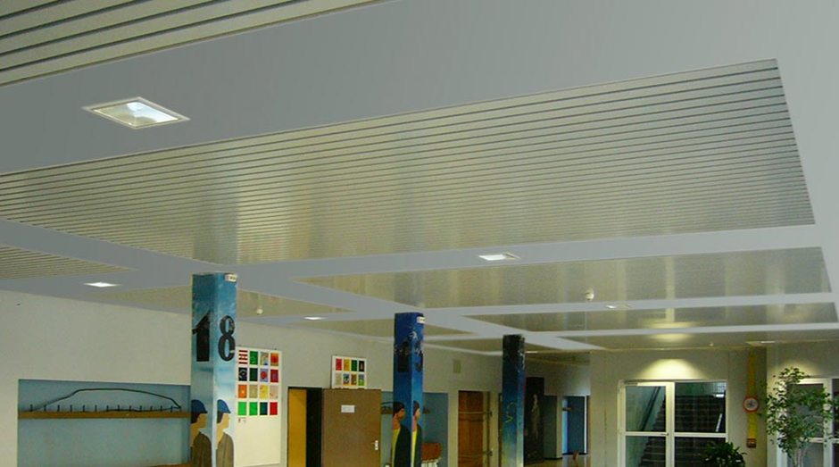 Abgehängte ORIGINAL DOBNER Aluminium-Paneeldecke Typ K-84 in einem Schulgebäude